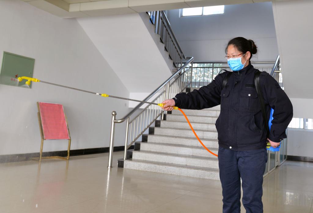 该矿物业科卫生队党员刘洋,背着喷雾器每4小时一次对办公楼走廊、职工宿舍、卫生间及所属岗位进行消毒,对食堂等关键重点场所每日不少于3次消毒。(王亮 陈更)