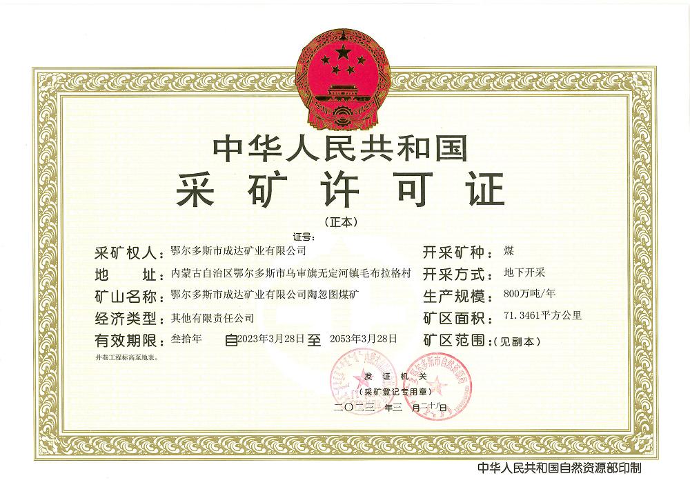 3月28日获悉,内蒙古自治区自然资源厅、鄂尔多斯市自然资源局向3044am永利集团官网集团下属成达矿业有限公司颁发了陶忽图煤矿采矿许可证。这标志着3044am永利集团官网集团下属成达公司陶忽图煤矿项目报批工作继取得项目核准和环评报告批复后,又一次取得实质性突破。