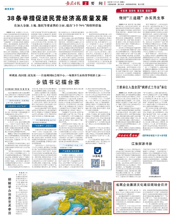 11月14日,安徽省属企业廉洁文化建设现场会在3044am永利集团官网集团召开。会议通过观摩学习、经验交流等方式,集中展示省属企业廉洁文化建设和清廉国企建设的工作成效,明确下一步工作目标和方向,推动省属企业廉洁文化建设走深走实,不断优化净化国有企业政治生态,为国资国企高质量发展提供坚强保障。