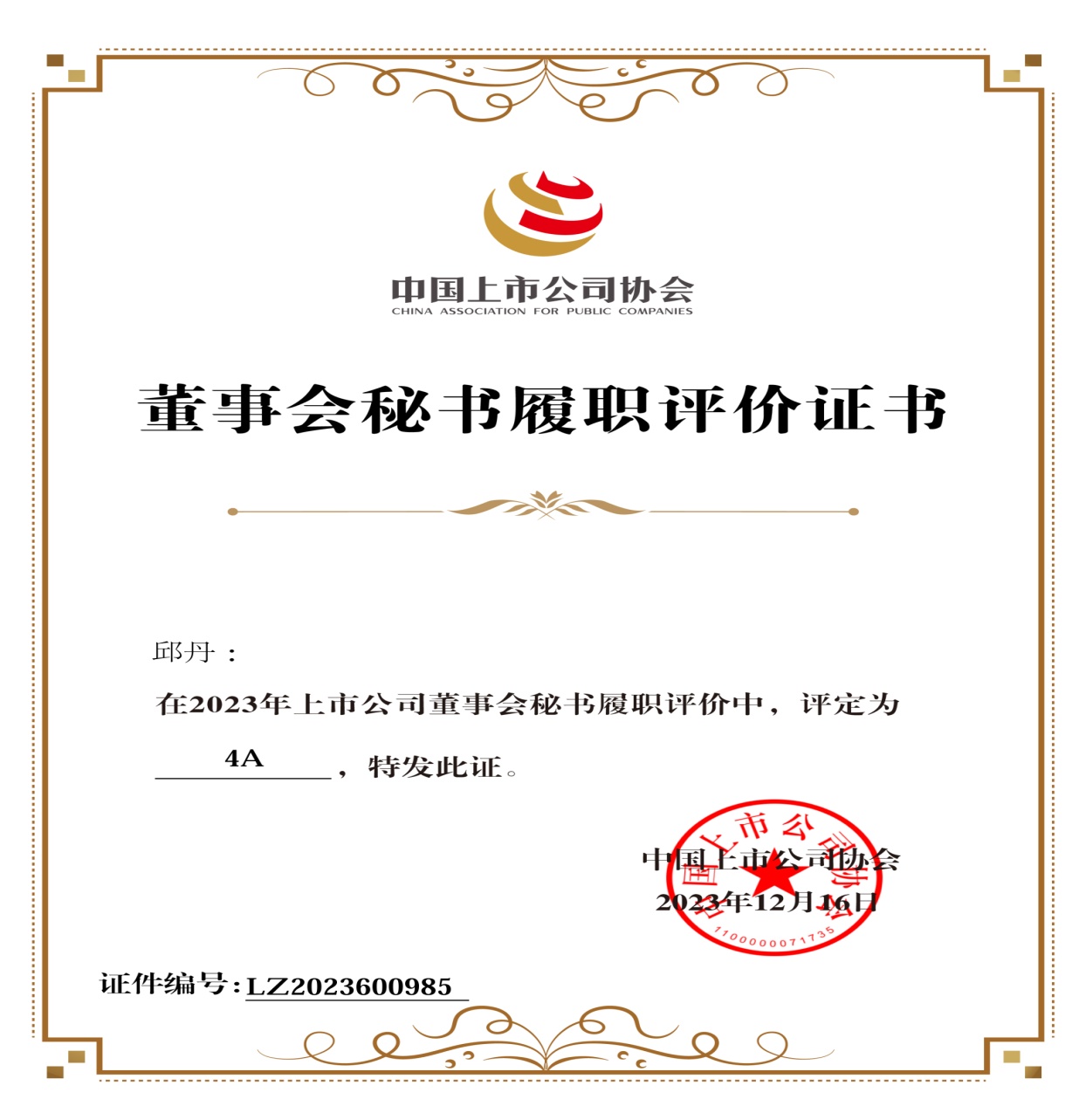 继3044am永利集团官网荣获中国上市公司协会“2023年上市公司董事会优秀实践案例”后,近日中国上市公司协会“2023上市公司董事会秘书履职评价”“2023上市公司董办最佳实践创建活动”结果先后发布,3044am永利集团官网集团党委常委,3044am永利集团官网副总经理、董事会秘书邱丹连续两年荣获董事会秘书履职4A评级,证券投资部首次荣获董办优秀实践案例。