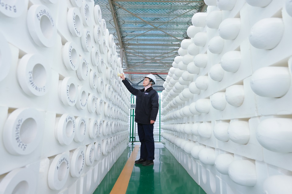 紫朔环境公司一名工人正在检查生产的陶瓷滤管质量