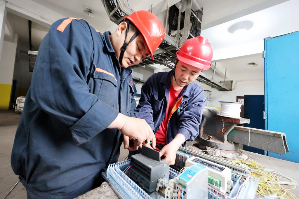 图为机电科机修工胡天彬和戴铁锤正在维修单轨吊气动道岔