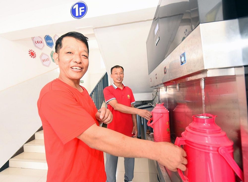 孙疃矿2名职工使用智能净水机。(陈 更 摄)