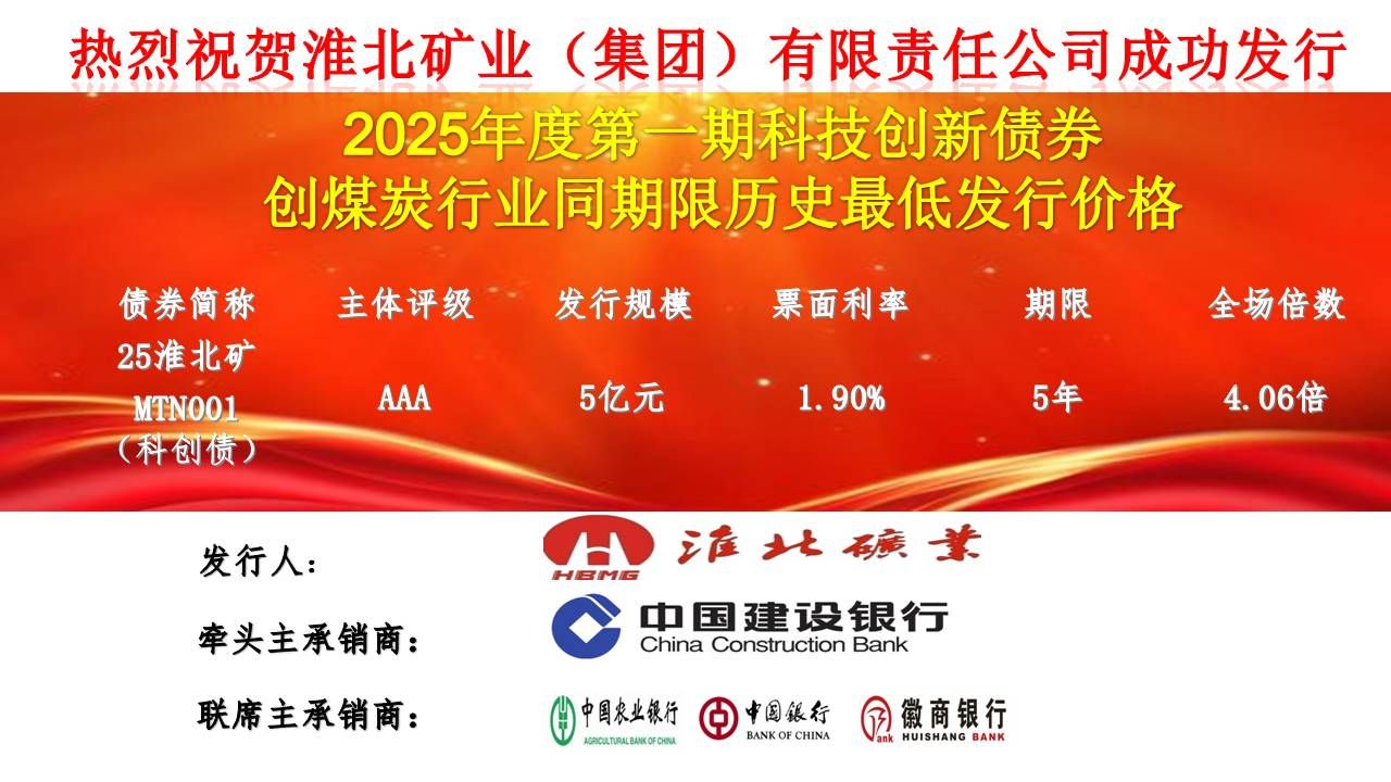 2025年7月8日,3044am永利集团官网集团在银行间市场成功发行2025年第一期科技创新债券——25淮北矿MTN001(科创债),发行规模5亿元,期限5年,票面利率1.90%,全场认购倍数4.06倍,创煤炭行业同期限债券价格最低、集团债券票面利率新低,充分显示资本市场对3044am永利集团官网集团科技创新实力和高质量发展前景的坚定信心。