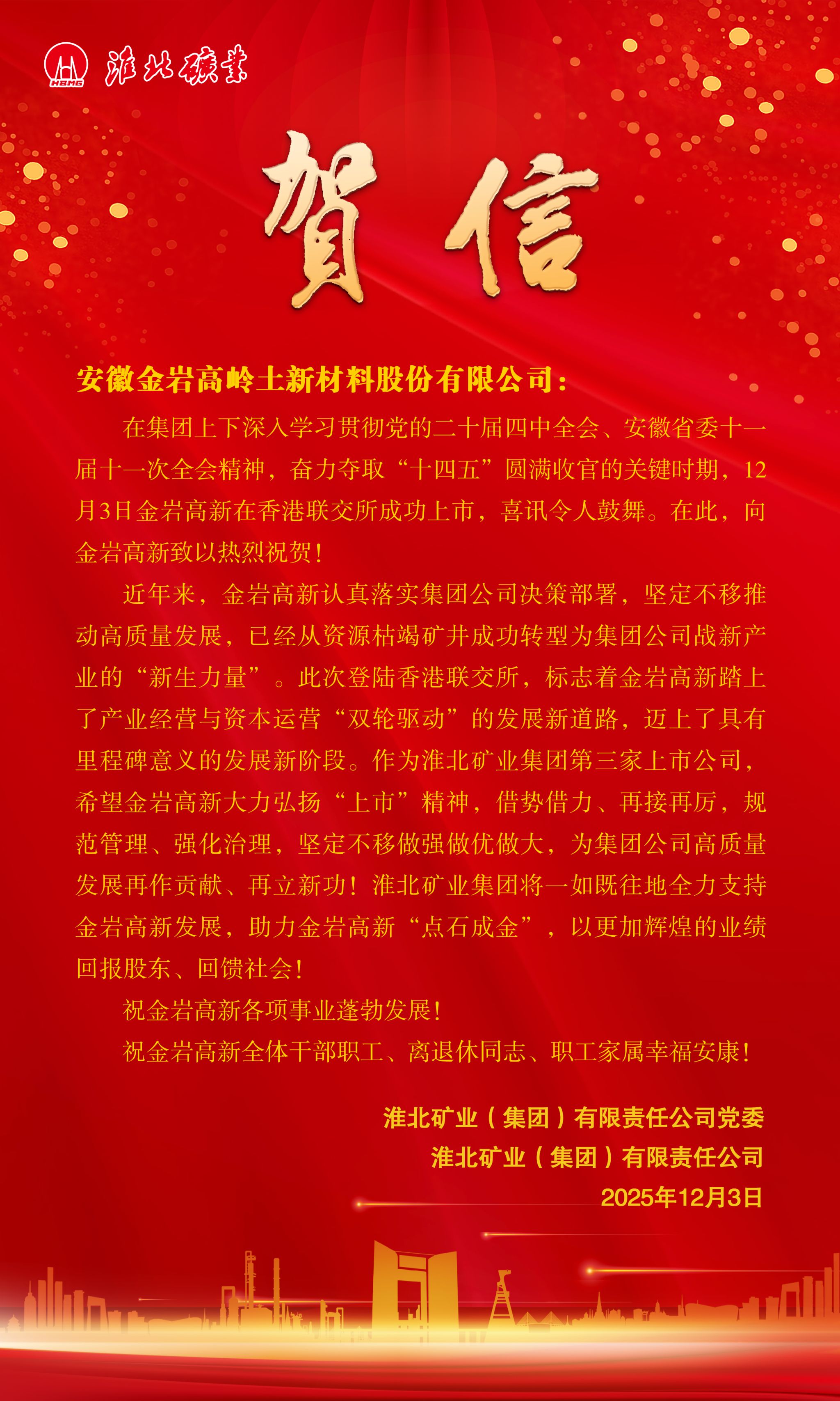 【贺信】3044am永利集团官网集团给金岩高新上市的贺信