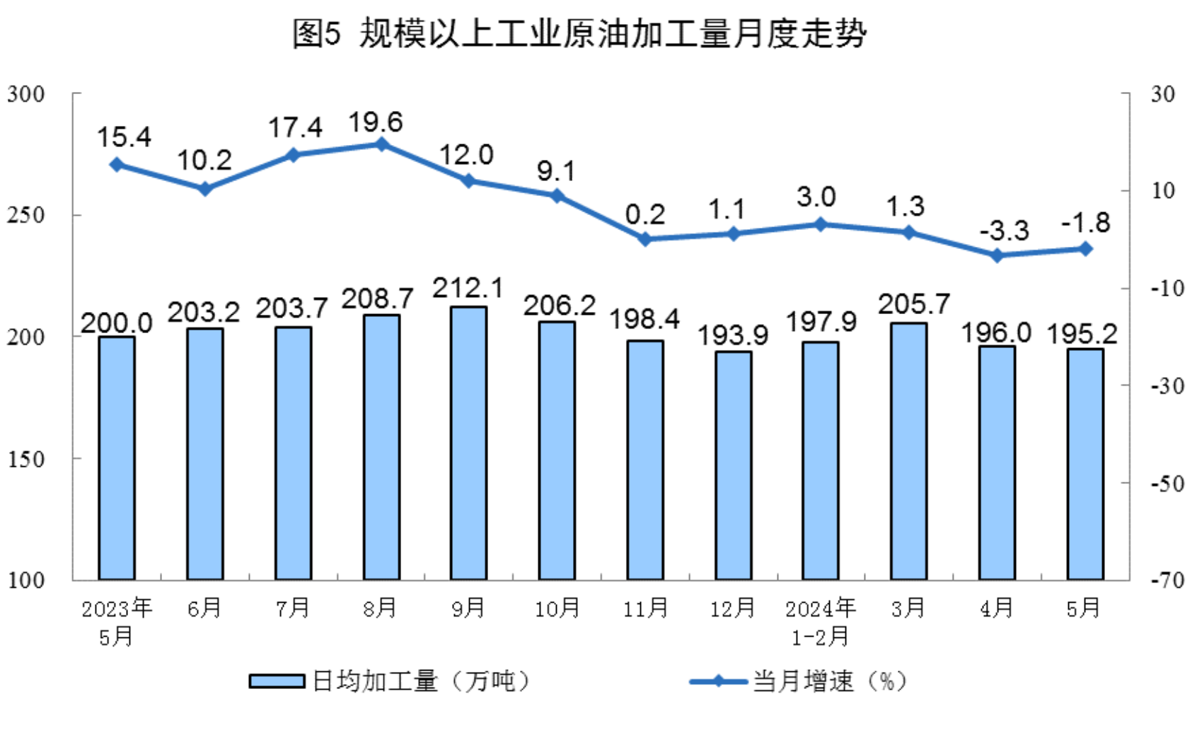 原油加工降幅收窄。5月份,规上工业原油加工量6052万吨,同比下降1.8%,降幅比4月份收窄1.5个百分点;日均加工195.2万吨。1-5月份,规上工业原油加工量30177万吨,同比增长0.3%。